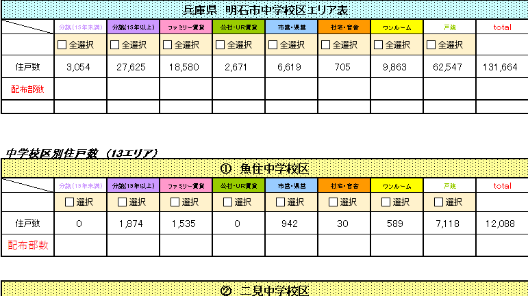 〇○中学校区と△△中学校区で、ファミリ―賃貸と築15年以上の分譲マンションに配布したい。などのご要望にも対応可能です。