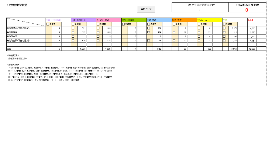 中学校区別だけでなく〇○町と□□町に配布したい。〇〇町はUR賃貸だけ、□□町はファミリー賃貸とワンルームに配布してほしい。などのご要望にも対応可能です。